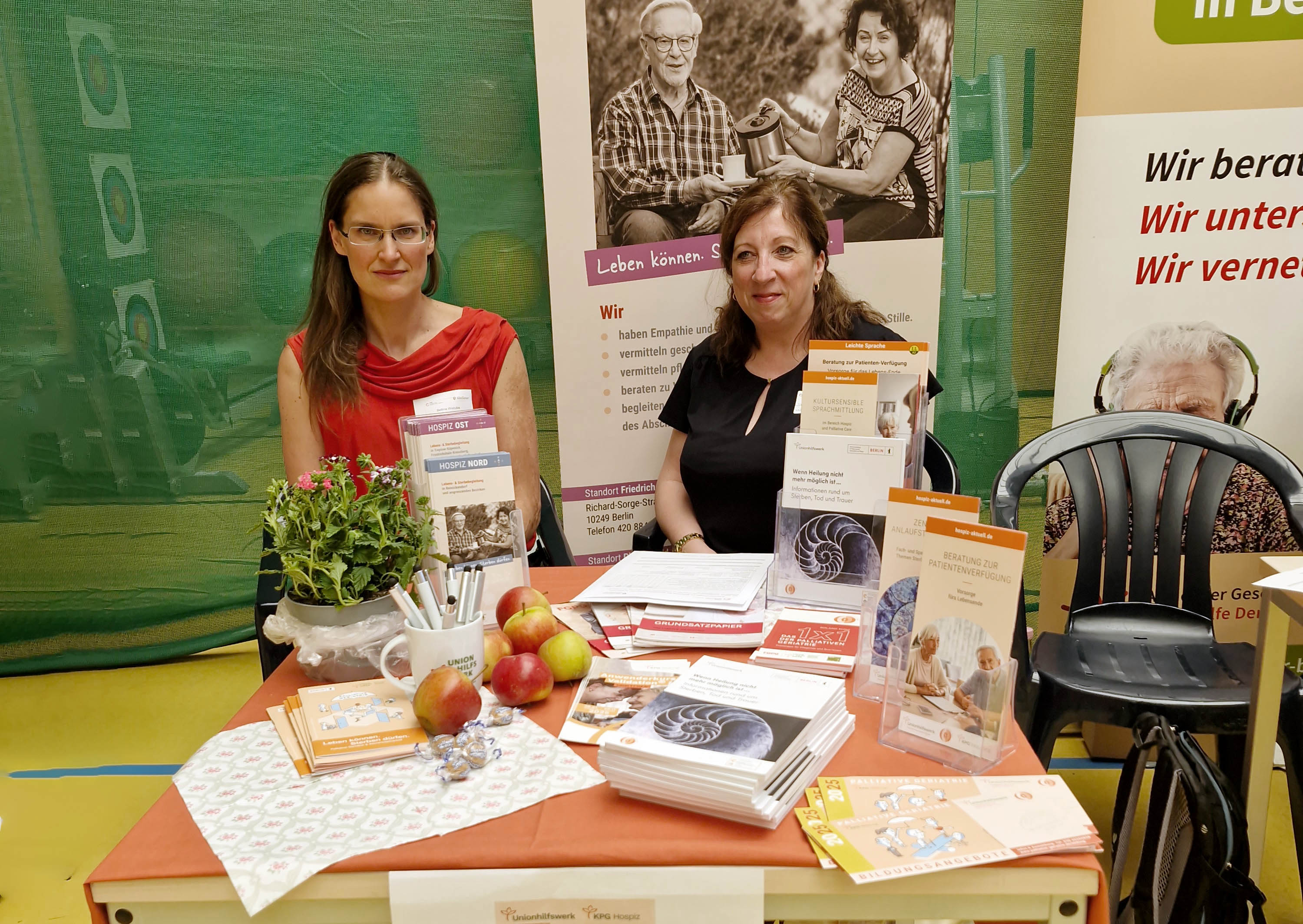 Susanne Lemoine vom Hospiz Nord und Bettina Wistuba, Hospiz Ost, standen dem interessierten Fachpublikum dabei Rede und Antwort z. B. zu den Vorteilen und Möglichkeiten ambulanter Hospizarbeit, zu den Angeboten des Kompetenzzentrums Palliative Geriatrie und speziellen Bildungsangeboten wie der Validation nach Naomi Feil. Diese auf Empathie beruhende Kommunikationsmethode kann, von ausgebildeten Validations-Anwendern eingesetzt, viel für die psychosoziale Gesundheit und damit für mehr Lebensqualität demenziell erkrankter und altersverwirrter Menschen beitragen.