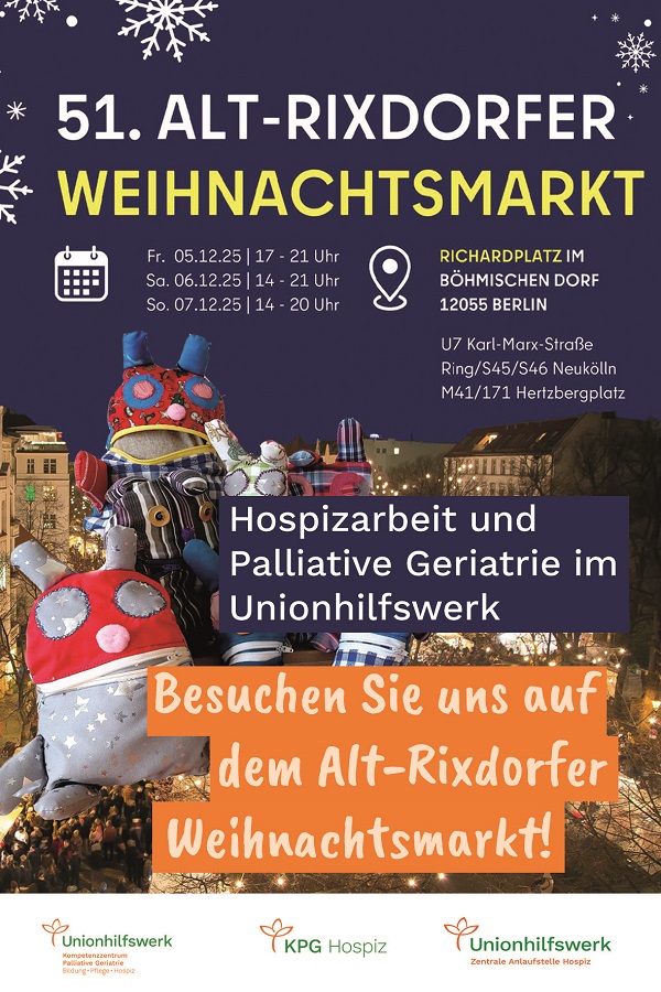 Für den Bereich Hospiz und Palliative Geriatrie im Unionhilfswerk, zu dem auch die Zentrale Anlaufstelle Hospiz gehört, ist die Teilnahme eine Chance: „Der Alt-Rixdorfer Weihnachtsmarkt ist etwas Besonderes und Anziehungspunkt für Menschen aus der ganzen Welt. Für uns also eine tolle Möglichkeit, unsere wichtige Arbeit vorzustellen und über die Möglichkeiten zu informieren, sich zu engagieren – zum Beispiel als Lebens- und Sterbebegleiter in unserem Hospizdienst oder in der ehrenamtlichen Patientenverfügungsberatung“, ist Bereichsleiter Dirk Müller überzeugt.