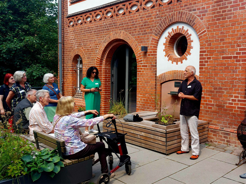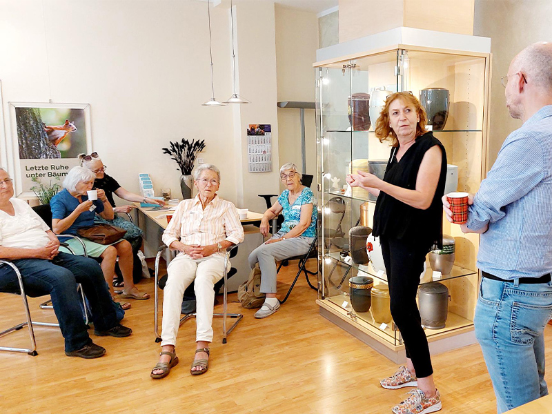 Im Bestattungshaus Schmidt & Co., das einsamen Menschen im Kiez ein wichtiger Anlaufpunkt ist, wurde den Teilnehmern der Tour dann das Konzept des Erzähl-Cafés vorgestellt: In Kooperation mit dem KPG fand dieses Format wenige Tage zuvor zum ersten Mal statt und das mit gutem Erfolg: Eine Reihe von Anwohnern und Menschen, die durch die Bestatterinnen begleitet wurden, nutzen das Erzähl-Café, um sich auszutauschen, zuzuhören oder die eigene Geschichte zu erzählen – zusammen ist man eben auch in Schmerz und Trauer weniger allein ...