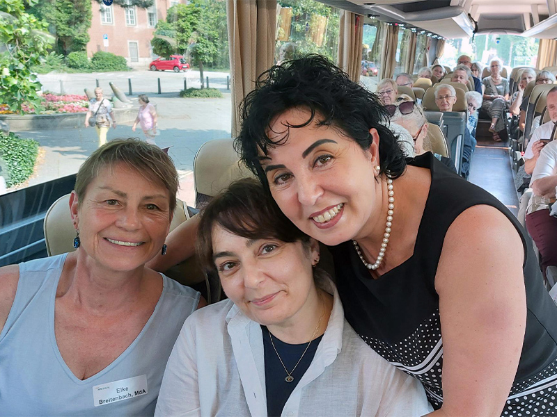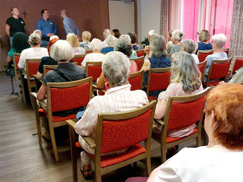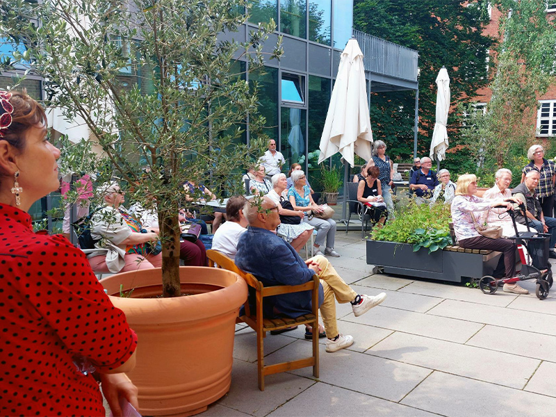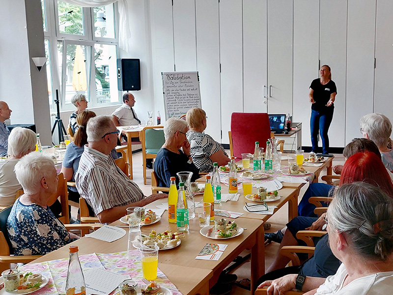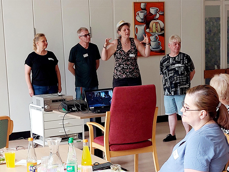 Weiter ging es dann in den Pankower Ortsteil Niederschönhausen, wo ein besuch im Pflegewohnheim "Günther Hesse" des Unionhilfswerks auf dem Programm stand. Auf eindrucksvolle und sehr emotionale Weise stellten die Mitarbeiterinnen hier die Validation® nach Naomi Feil vor. Diese ganz besondere Methode der Kommunikation kann –praktiziert von speziell geschulten Validationsanwenderinnen – demenziell erkrankte Menschen vor innerer Einsamkeit bewahren oder aus dieser herauszuholen. Das Kompetenzzentrum Palliative Geriatrie ist mit seinem Ableger KPG Bildung seit 2020 eine Autorisierte Validationsorganisation nach Naomi Feil (AVO)® und bietet zertifizierte Kurse und Weiterbildungen dazu an.