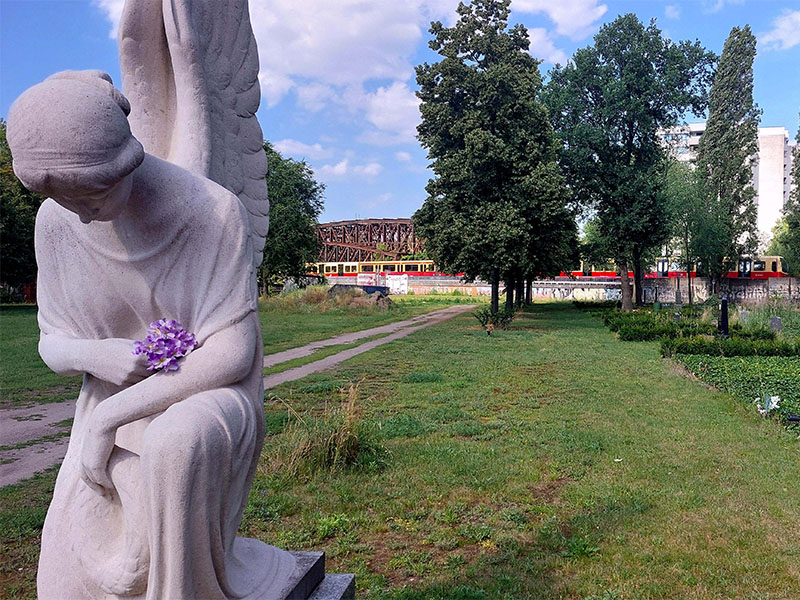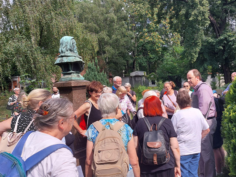 Einen sehr stimmungsvoller Abschluss der "Tour de Palliative 2024" bot schließlich die Führung über den Alten Domfriedhof St. Hedwig und den unmittelbar angrenzenden Friedhof der Französischen Gemeinde an der Liesenstraße in Mitte, wo auch der große Theodor Fontane begraben ist. Der Domfriedhof St. Hedwig wiederum ist der älteste katholische Friedhof Berlins. Auf dem Gelände befindet sich darum auch das Original-Turmkreuz des Berliner Doms. Und auch von einem dunklen Kapitel deutscher Geschichte zeugt der Friedhof: Direkt über den Gottesacker verlief der Todesstreifen, schnitt die Berliner Mauer die Stadt entzwei und stürzte viele Menschen in Schmerz, Trauer und Einsamkeit.