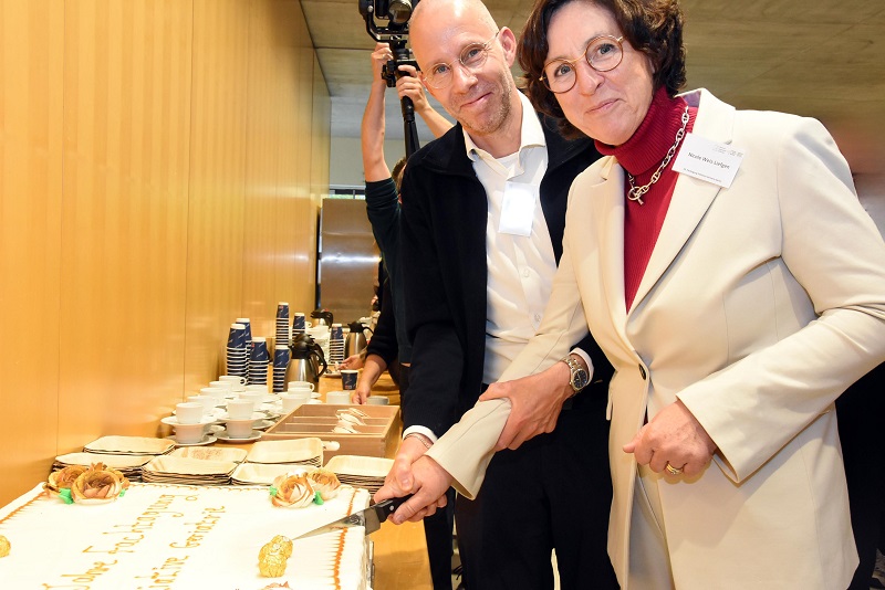 Die Jubiläumstorte wird angeschnitten von Nicole Weis-Liefgen, Projektleiterin Netzwerk Palliative Geriatrie Luxemburg, und Dirk Müller  -